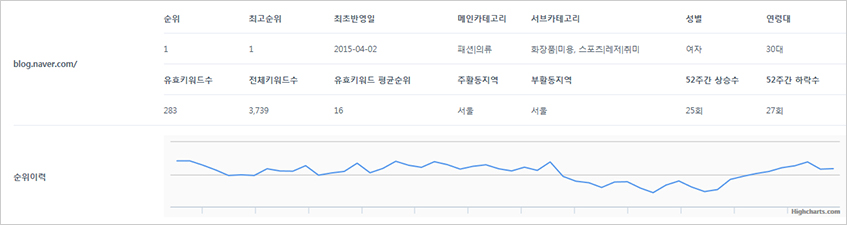 또한 최근 1년간의 순위 이력을 조회하여 블로그의 활동성과 인지도 분석이 가능합니다.